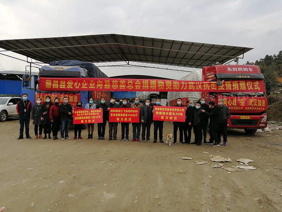 2020年3月6日,福建省順昌縣愛心企業向縣慈善總會定向捐贈的第二批物資助力武漢捐贈儀式在順昌縣綠通物流舉行。由臺盟福建省委會、福建省順昌合億農產品開發有限公司捐贈的綠仙椒罐頭10噸(3千件)、福建順昌茂盛食品有限公司捐贈的清水罐頭20噸、福建省順昌縣工廠化食用菌同業協會捐贈的海鮮菇18800斤等物資帶著順昌人民與武漢人民共克時艱、共抗疫情的深情厚意無償馳援武漢。