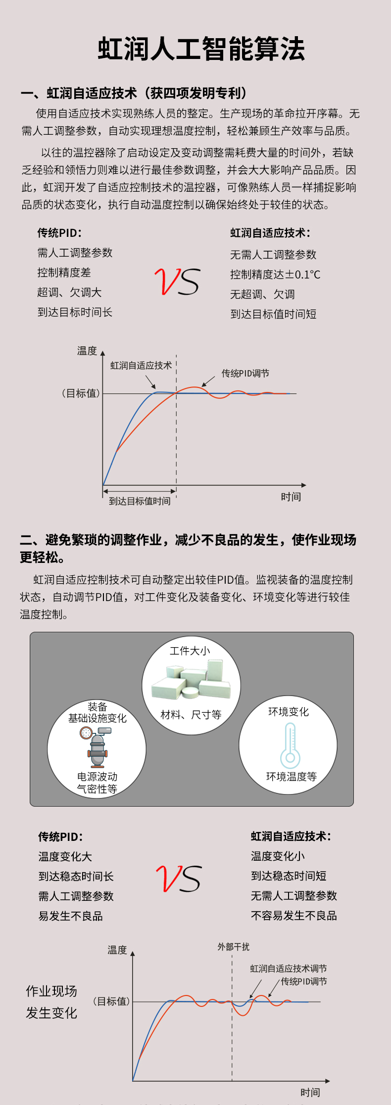 虹潤公司是專業(yè)生產(chǎn)溫控器的國家專精特新“小巨人”企業(yè)。生產(chǎn)的人工智能溫控器,具有真正人工智能算式,無需人工整定參數(shù),控制精度可達(dá)±0.1°C,多種輸出類型,高抗干擾等特點(diǎn)。產(chǎn)品獲得模糊PID控制儀及控制方法、人工智能調(diào)節(jié)器、智能化控制器、移相觸發(fā)控制器、閥門自動(dòng)手動(dòng)無擾動(dòng)操作控制方法及裝置等5項(xiàng)國家發(fā)明專利,主持起草工業(yè)過程控制系統(tǒng)用模擬輸入兩位或多位輸出儀表、物聯(lián)網(wǎng)智能溫度儀表通用技術(shù)條件、工業(yè)過程測量和控制系統(tǒng)用智能調(diào)節(jié)器等3項(xiàng)國家標(biāo)準(zhǔn),以及通信系統(tǒng)多通道數(shù)據(jù)采集控制終端規(guī)范軍用標(biāo)準(zhǔn),參與國際5G標(biāo)準(zhǔn)制定,取得模糊PID溫控儀等3項(xiàng)相關(guān)軟件著作權(quán)。產(chǎn)品廣泛應(yīng)用于電力、石化,冶金、制藥、食品等幾乎所有工業(yè)現(xiàn)場,實(shí)現(xiàn)精準(zhǔn)控溫,保障生產(chǎn)安全與質(zhì)量。
