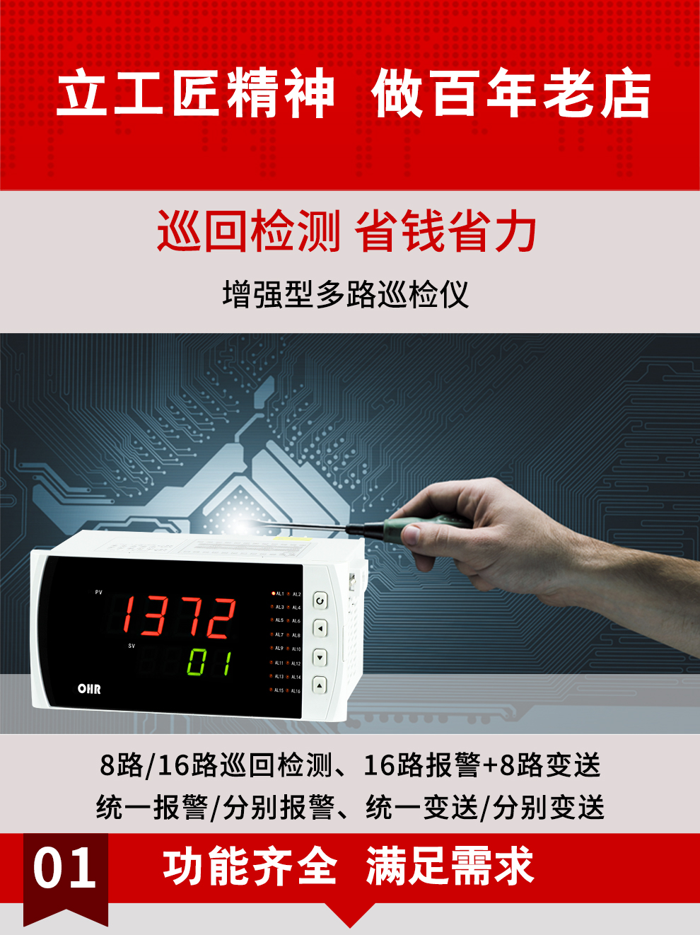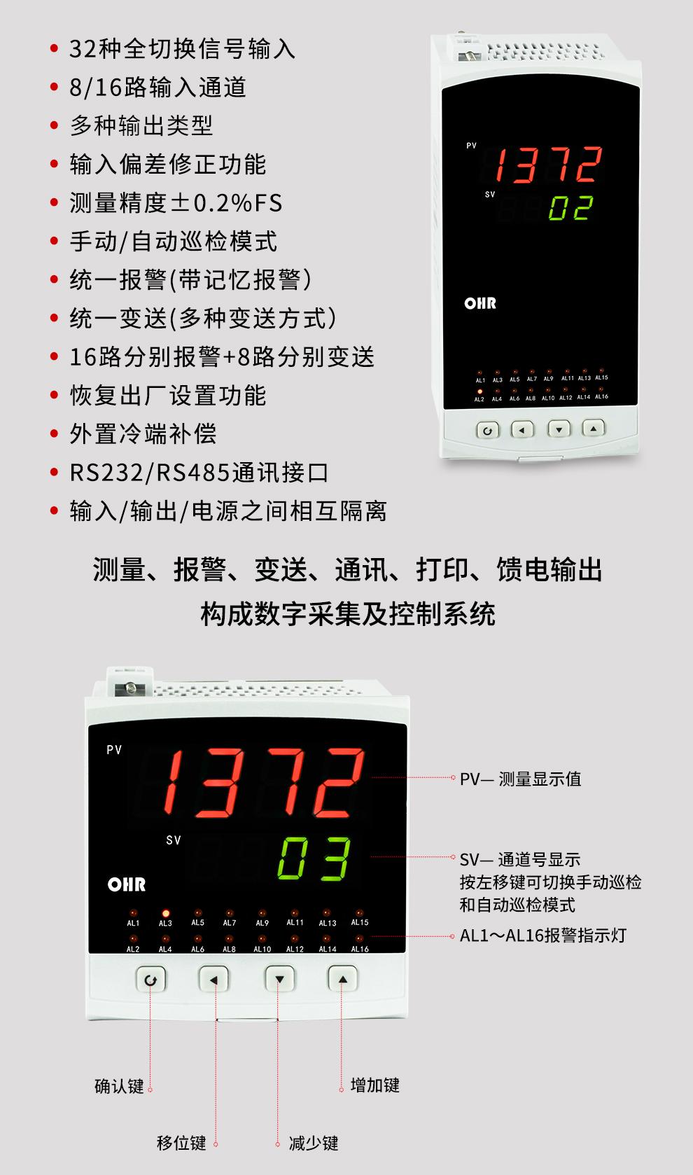 OHR-E702系列增強型多回路測量顯示控制儀針對現(xiàn)場溫度、壓力、液位、速度等各種信號進行采集、顯示、控制、遠傳、通訊、 打印等處理,構成數(shù)字采集系統(tǒng)及控制系統(tǒng),適用于需要進行多測量點巡回檢測的系統(tǒng)。