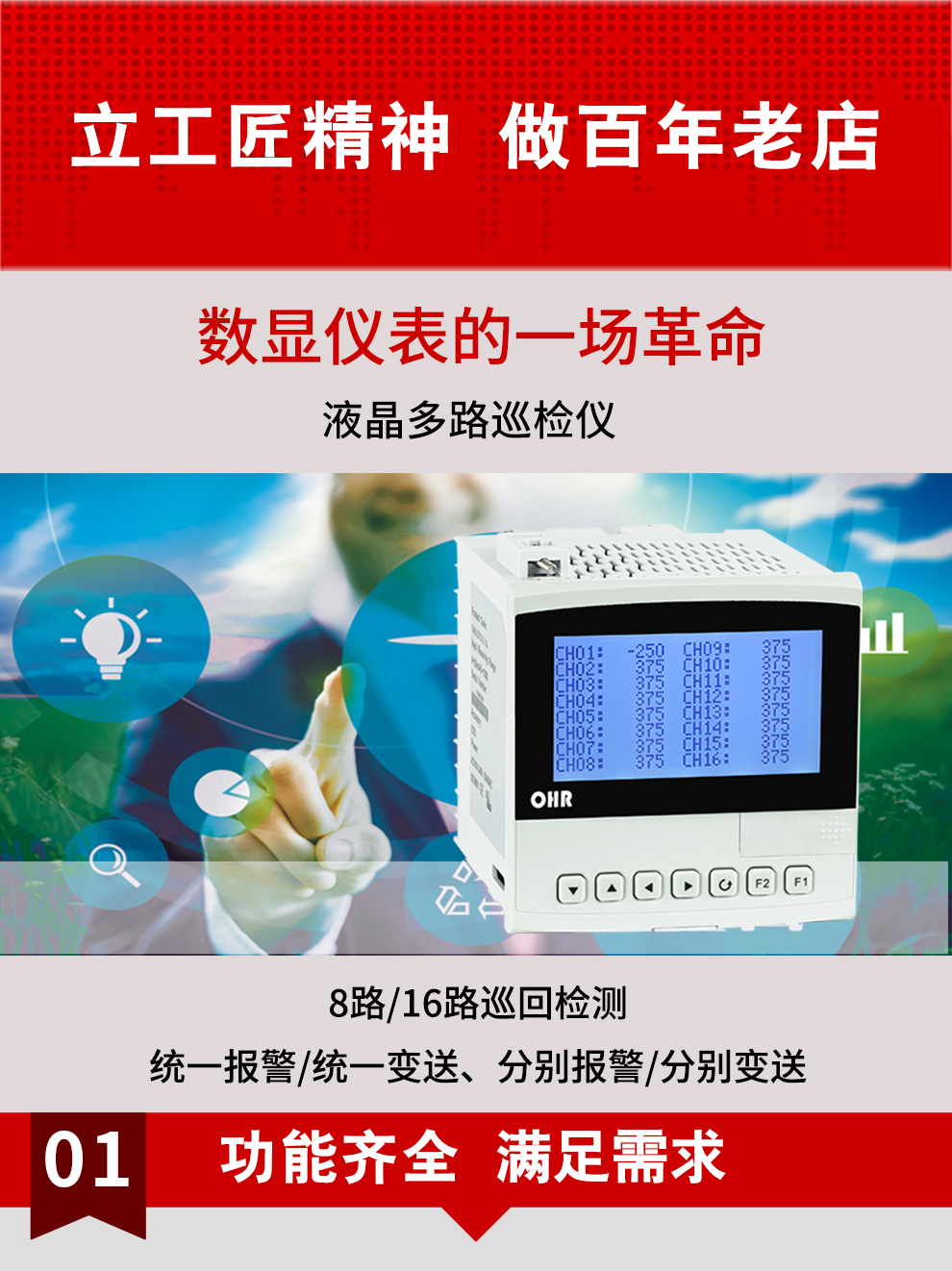 虹潤公司是專業(yè)生產(chǎn)多路溫度巡檢儀的國家專精特新“小巨人”企業(yè),生產(chǎn)的液晶多路巡檢儀,具有8路/16路測量通道,全切換信號(hào)輸入,統(tǒng)一報(bào)警統(tǒng)一變送輸出,分別報(bào)警分別變送輸出,RS485/RS232通訊等特點(diǎn)。產(chǎn)品獲得巡回檢測顯示方法及裝置、儀表殼體等2項(xiàng)國家發(fā)明專利,主持起草工業(yè)過程控制系統(tǒng)用模擬輸入兩位或多位輸出儀表、物聯(lián)網(wǎng)智能溫度儀表通用技術(shù)條件等2項(xiàng)國家標(biāo)準(zhǔn),以及通信系統(tǒng)多通道數(shù)據(jù)采集控制終端規(guī)范軍用標(biāo)準(zhǔn),參與國際5G標(biāo)準(zhǔn)制定,取得液晶多回路測量顯示控制儀等4項(xiàng)相關(guān)軟件著作權(quán)。產(chǎn)品廣泛應(yīng)用于電力、石化、冶金、制藥、水處理、機(jī)械配套等各種工業(yè)現(xiàn)場。
