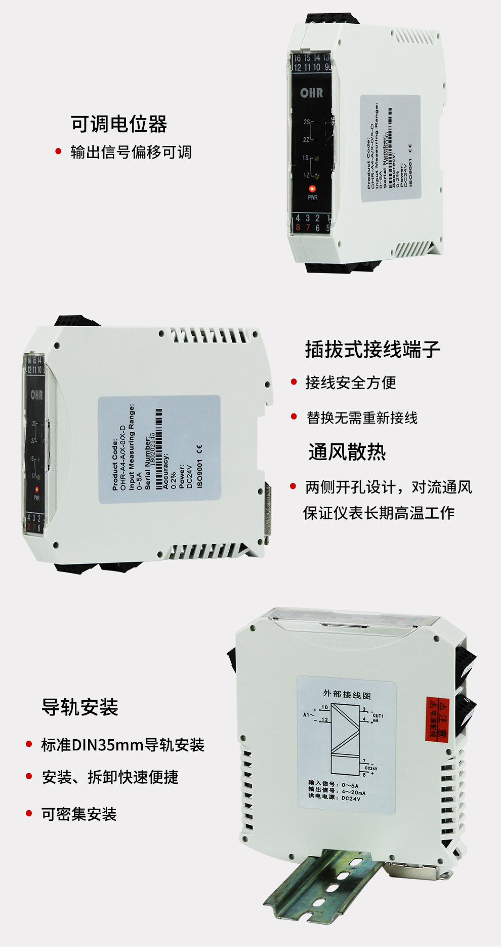 OHR-A4系列簡易型電量變送器用電磁隔離技術(shù),對電網(wǎng)或電路中的交流電流、電壓進行實時測量,它可將被測交流電流、電壓轉(zhuǎn)換成按線性比例輸出的直流電流或者直流電壓信號,產(chǎn)品具有高精度、隔離電壓高、相應(yīng)時間快、低漂移、低功耗等特點。