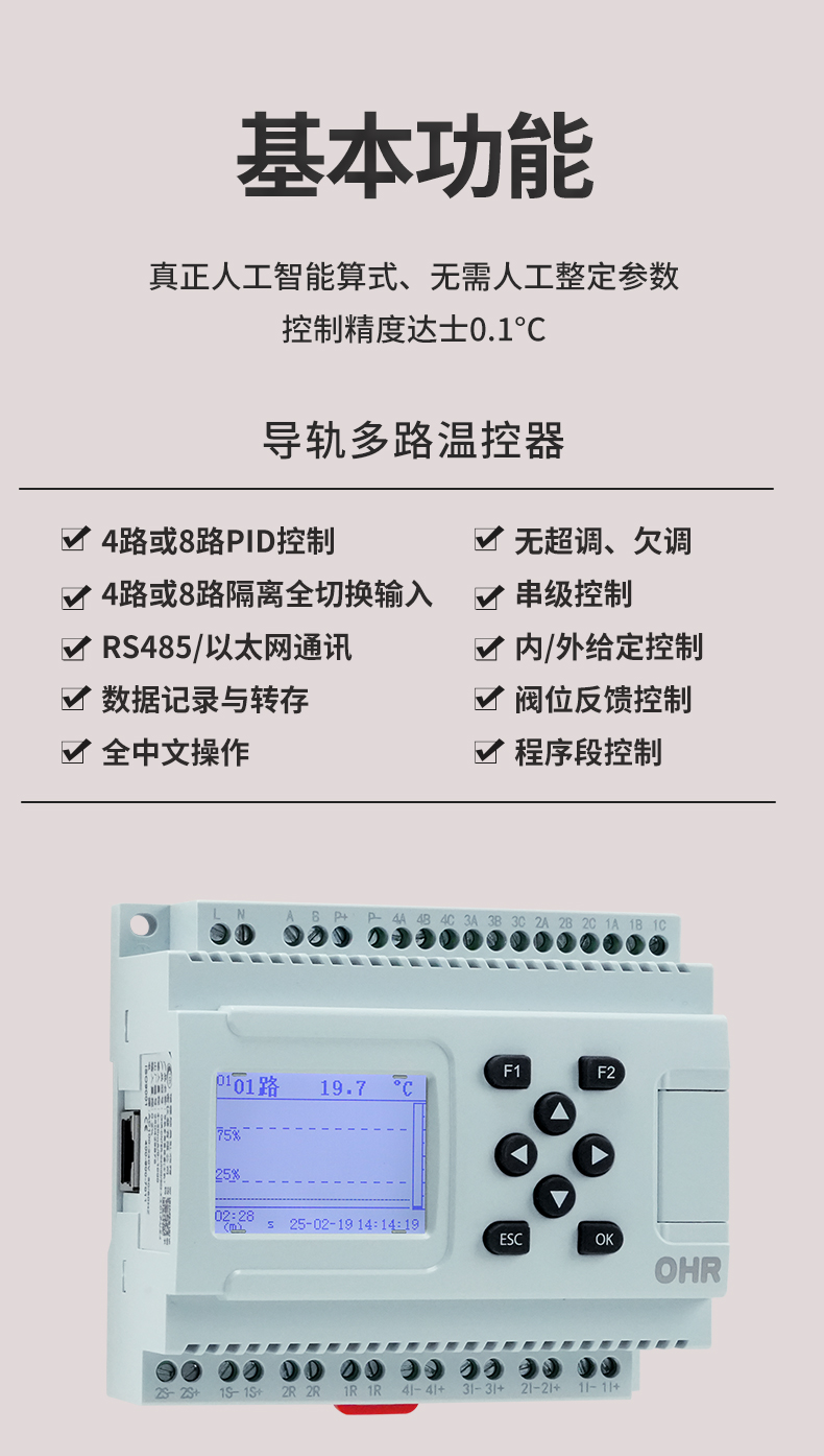 虹潤公司是專業生產溫控器的國家專精特新“小巨人”企業。生產的導軌多路溫控器,具有4路或8路PID控制,真正人工智能算式,無需人工整定參數,控制精度達士0.1°C,數據記錄與轉存等特點。產品獲得智能化控制器、人工智能調節器及調節方法、模糊PID控制儀及控制方法、一種平板無紙記錄儀、巡回檢測顯示方法及裝置等5項國家發明專利,主持起草物聯網智能記錄儀表通用技術條件、物聯網智能溫度儀表通用技術條件、工業過程測量和控制系統用智能調節器等3項國家標準,通信系統多通道數據采集控制終端規范軍用標準,以及空間數據與信息數據傳輸系統等2項航天標準,參與國際5G標準制定,取得液晶溫控器儀表等3項相關軟件著作權。產品廣泛應用于電石化、工業爐、試驗設備、注塑機械、包裝機械等需要對現場溫度進行監測控制的行業。